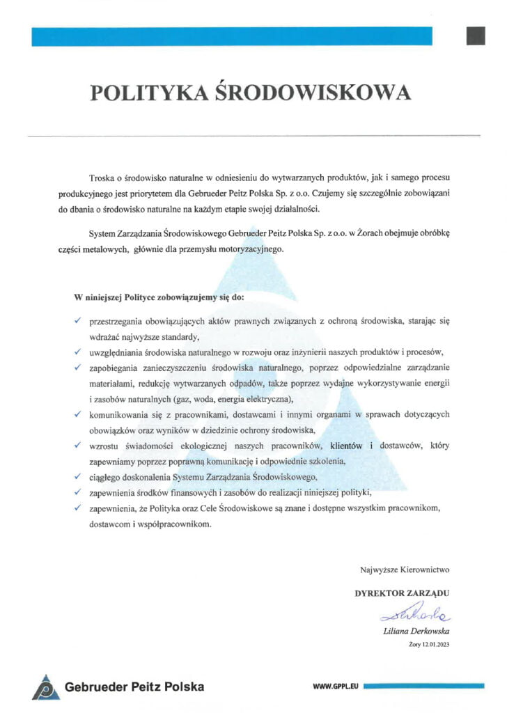 Troska o środowisko naturalne w odniesieniu do wytwarzanych produktów, jak i samego procesu produkcyjnego jest priorytetem dla Gebrueder Peitz Polska Sp. z o.o. Czujemy się szczególnie zobowiązani do dbania o środowisko naturalne, na każdym etapie swojej działalności.