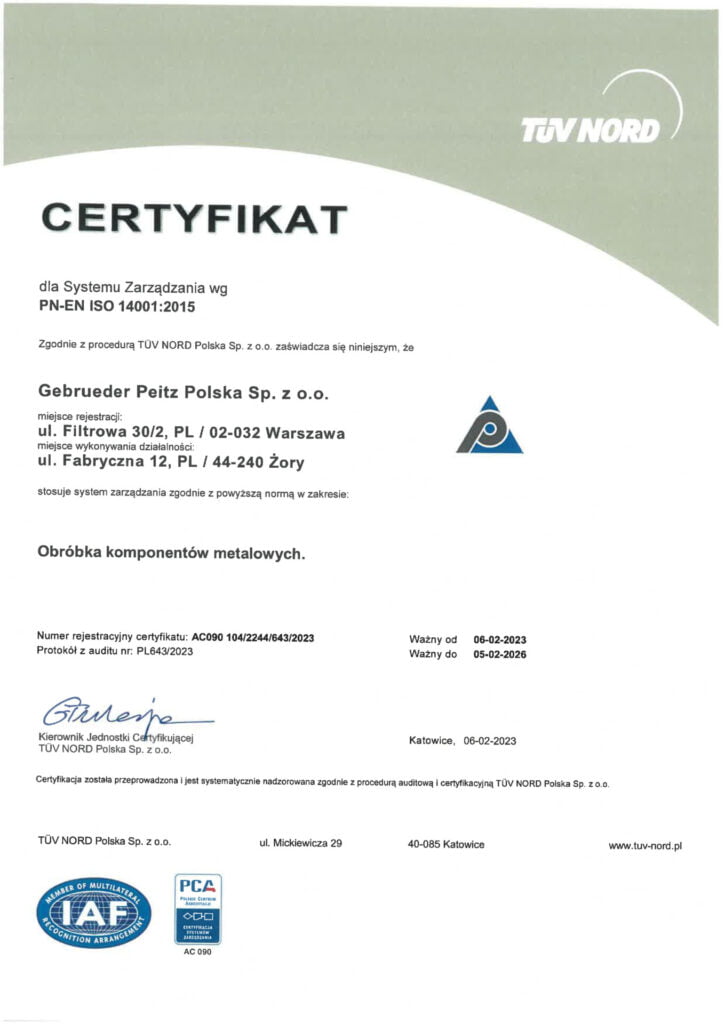 Jakość Gebrueder Peitz Polska. Według nowoczesnych miar statystycznych, firma Gebrueder Peitz Polska Sp. z o.o. spełnia lub przewyższa standardy jakości jednej z najbardziej wymagających branż na świecie – branży motoryzacyjnej. IATF 16949:2016, wydany przez TÜV NORD CERT dla Gebrueder Peitz Polska Sp. z o.o. z datą ważności do dnia 27.09.2024 r.